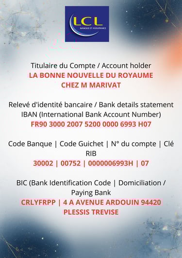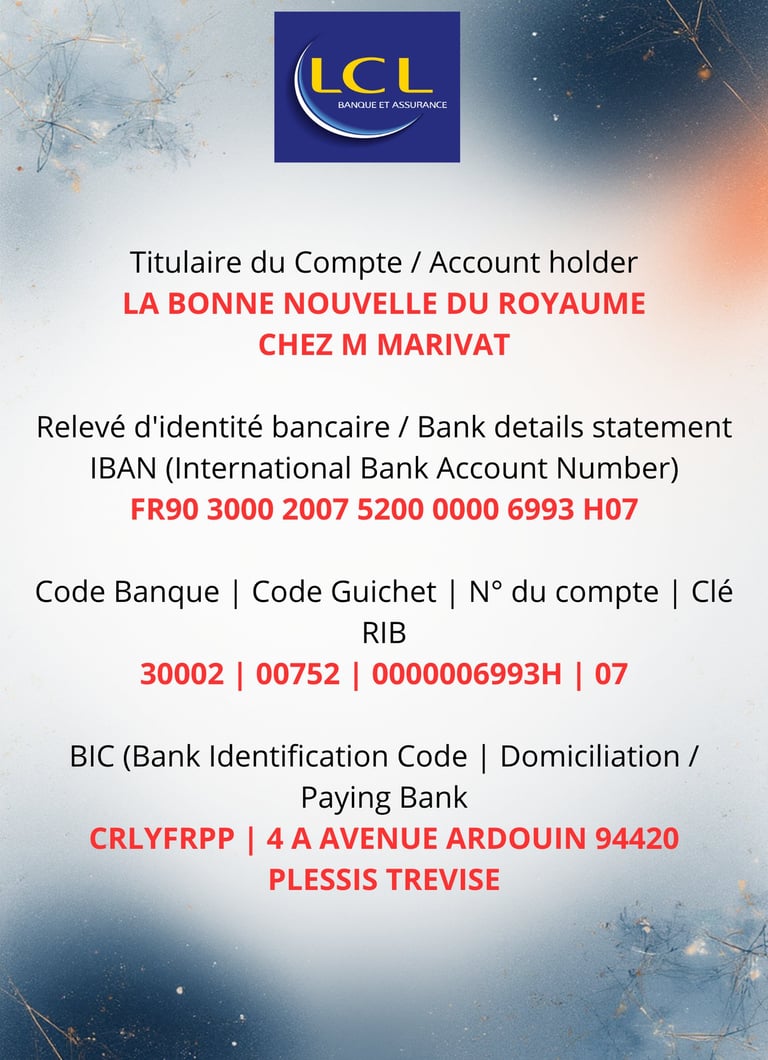 Nous vous remercions d’utiliser les coordonnées indiquées ci-dessus pour tout don effectué par virement bancaire.